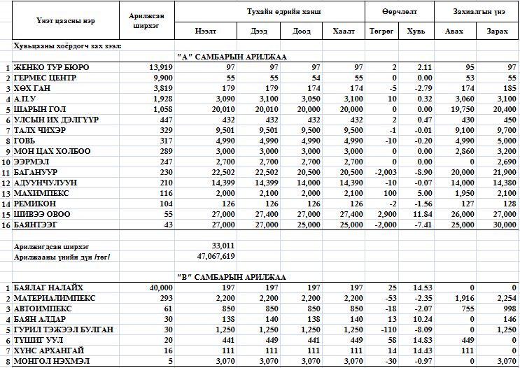 Нийт 24 үнэт цаас арилжсанаас 9 үнэт цаасны ханш өсч, 11 үнэт цаасны ханш буурч, 4 үнэт цаасны ханш тогтмол байлаа.