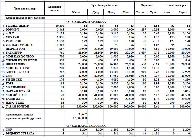 Өнөөдрийн арилжаагаар нийт 24 ХК-ийн 34.6 мянган ширхэг хувьцааг 83.1 сая төгрөгөөр арилжлаа.