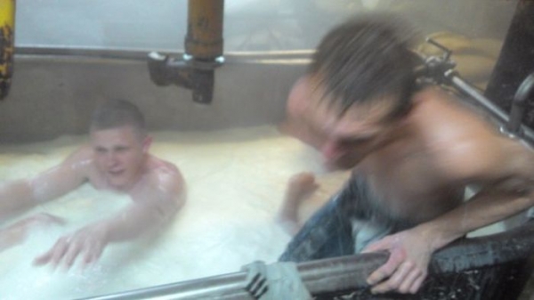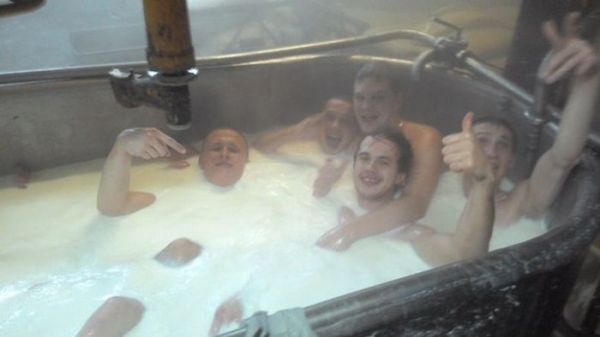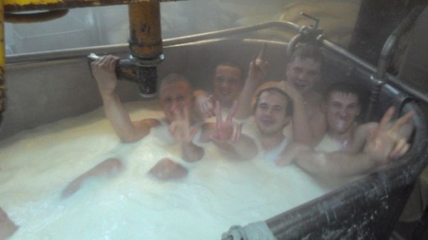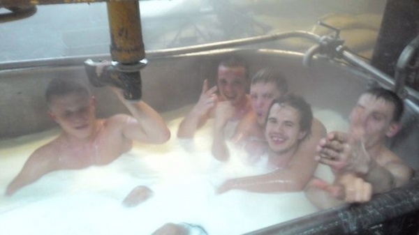 Оросын бяслагны үйлдвэрийн ажилчид сүүндээ шумбаж байгаа зураг цахим хуудсаар тарж олон хүний дургүйцлыг хүргэжээ. Тэд таны харж байгаачлан сүүтэй онгоцонд усанд орохоос наахнуур хагас нүцган шумбасан зургаа дэлгэсэн байжээ.