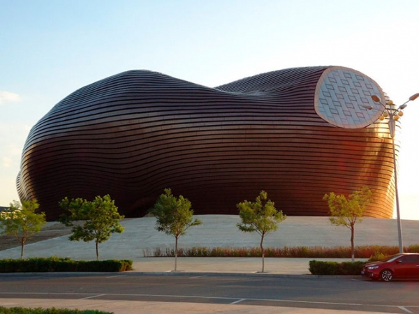 Мөнөөх асруудад хүннү дээлээр гоёж, монгол хатдын зүүсгэл чимэг, толгойн гоёлоор гангарсан үзэсгэлэнт охид орсон гарсан нэгэнд хотынхоо танилцуулга, зурагт ном, СД-г бэлэглэн монгол бүсгүйн ааш ялдам мишээлээр угтаж үдэж суух юм. Монгол дархны бурхан ухааныг шингээсэн асар том домбыг доош тонгойлгосон нь муейн барилга юмсанж. Мөнөөх домбоны цоргоор тасралтгүй цутгах усны алтлаг дуслууд том мөнгөн аяганд гэрэл цацруулан бууна. Цаад талынх нь барилга өнгөт толин нүүртэйгээс усан оргилуурын ус алтлаг өнгөтэй харагддаг ажээ. Харин мөнгөн аяганы амсар дээр балчир жаалууд гүйлдэн бие биеэ усан буугаар шүршин хөгжилдөх нь үлгэрийн гэмээр шидэт мэдрэмж төрүүлнэ.