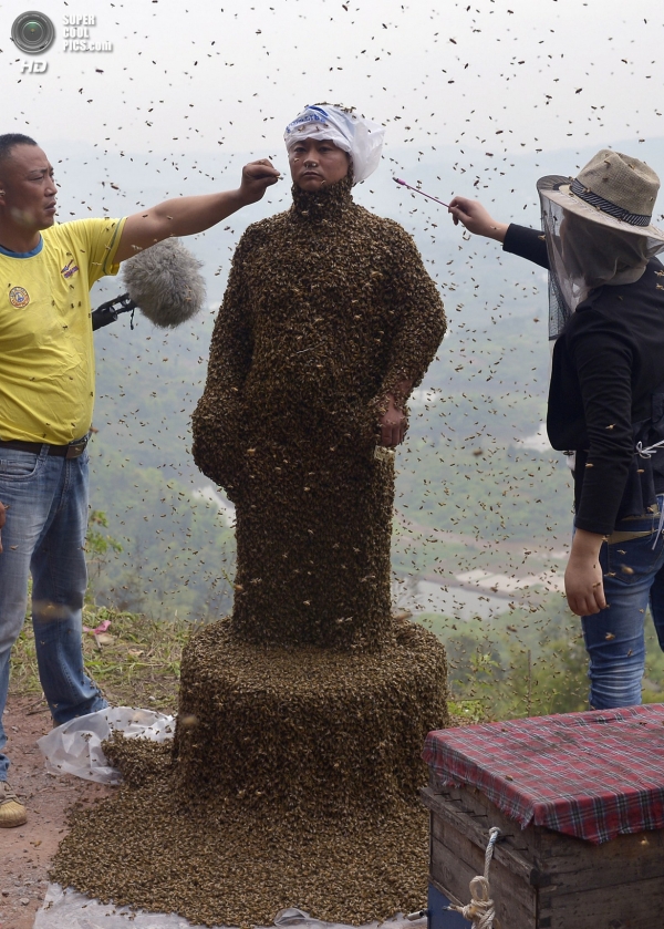 Хятадын Чонгкинг хотын 34 настай зөгийн аж ахуй эрхлэгч Чунцин Ши Пинг нь худалдан авагчдыг өөртөө татах зорилгоор биен дээрээ 460 мянган зөгий суулган хувцасласан нь хүмүүсийн анхаарлыг ихэд татжээ. Энэ үйл явц 15 минут орчим болсон бөгөөд зөгийнүүдийн нийт жин 45 килогрмм байжээ.