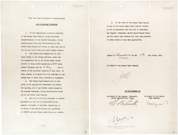 - Альфред Йодль, адмирал Фридебургтай хамт Герман бууж өгсөн гэх Реймсийн Актанд гарын үсэг зурлаа.
