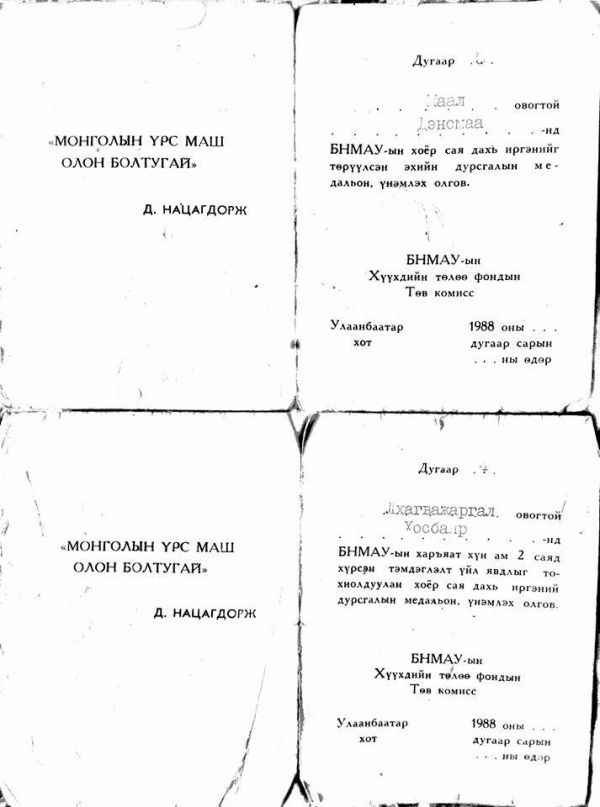 -Тиймээ, гурван өрөө орон сууц манайд өгсөн. Гэхдээ манайх аваагүй. Эмнэлгээс гараад байж байхад манай нөхөр цайны цагаараа ирээд “Нийтийн ахуйн үйлчилгээний газраас хоёр сая дахь иргэндээ гурван өрөө байр өгч байна. Байр авах уу” гэсээр ирсэн. Тэгэхээр нь би байр хүйтэн, аваад яахав дээ гэж хэлээд аваагүй. Нөхөр бид хоёр тухайн үеийн Ахуйн үйлчилгээнд хамт ажилладаг байсан юм. Түүнээс хойш 21 хоногийн дараа Эрүүл мэндийн Сайд П.Нямдаваа, Нийтийн ахуйн үйлчилгээний дарга Цэрэнхүү, Үйлдвэрчний зөвлөлийн дарга Баасанхүү, Залуучуудын эвлэлийн хорооны дарга Байгальмаа нар ирж хоёр сая дахь иргэний медаль гардуулсан. Хоёр сая дахь иргэний үе чацуутан 13 хүүхдийг хүлээн авч байсан. Манайх охиноо угждаг байсан юм. Аймгийн хүүхдийн сүүний газраас дугаарлуулахгүйгээр сүү өгч, ясли цэцэрлэг ховор байх үед саадгүй явуулж өгдөг байсан. Нийтийн ахуйн үйлчилгээний оёдлын бригадаас хоёр сая дахь иргэнийг халамжлан хүмүүжүүлэгч гэж хүн гаргаж өгч байлаа.