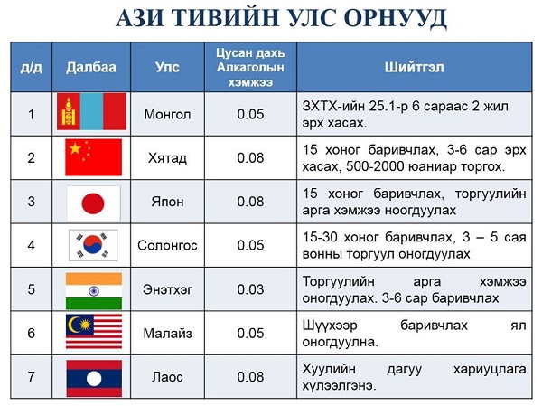 Монгол Улсын согтуу жолоочоос болж гардаг ослын тоогоороо нэлээд дээгүүрт бичигддэг ч авдаг арга хэмжээ нь арай л сул байна. Доорх хүснэгтээс харахад Хятад, Япон, Солонгос зэрэг орнуудад 15 хоног баривчилж, согтуу жолоо барьсан этгээдийн яс, маханд нь ойлгуулж өгдөг аж. Харин Сингапурт бол бүр жинхэнээсээ маханд нь мэдрүүлдэг байна. Сингапурт зургаан сар жолоо барих эрхээ хасуулахаас гадна “үхлийн” ташуурын амтыг заавал үзнэ. Гадны иргэдийг ч хамаагүй энэхүү ташуураар ороолгож шийтгэдэг энэ зарчим сингапурчуудын зүрхэнд орсон байдаг. Тиймдээ ч тус улсад согтуугаар жолоо барих тохиолдол маш бага байдаг аж.