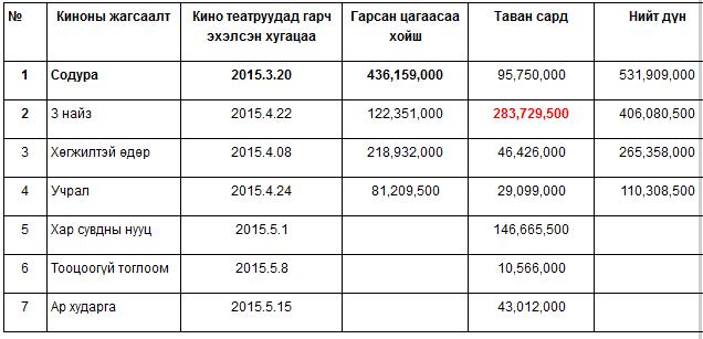 ШӨХТГ-аас энэ жилээс эхлэн Монгол киноны ашиг орлогын тухай мэдээллийг сар бүр хүргэж байгаа билээ. Тэгвэл таван сарын байдлаар кино театруудад нийт долоон Монгол кино гарч үзэгчдийн хүртээл болжээ. Үүнээс өнгөрсөн дөрөвдүгээр 8-ны өдөр нээлтээ хийсэн “Гурван найз яасан байх нь уу?” кино 283 сая 729 мянга 500 төгрөгийн ашиг орлого олж, орлогоороо тэргүүлсэн байна.