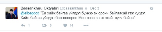 Мөн УИХ-ын гишүүн О.Баасанхүү "Би хийж байгаа үйлдэл бүхнээ эх оронч байгаасай гэж хүсдэг. Хийж байгаа үйлдэл болгоноороо Монголоо зөвтгөхийг хүсч байна" гэжээ.