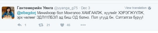 Тэгвэл үүний хариуд нь ТТЭНН-ын дарга, УИХ-ын гишүүн асан Г.Уянга “Минийхээр бол Монголоо хамгаалж, хуулийг хэрэгжүүлж, эрх чөлөөг эдлүүлбэл ад биш од болно. Поп үгүүд байна. Сэтгэлгээ буруу гэж үгүйсгэсэн байв.