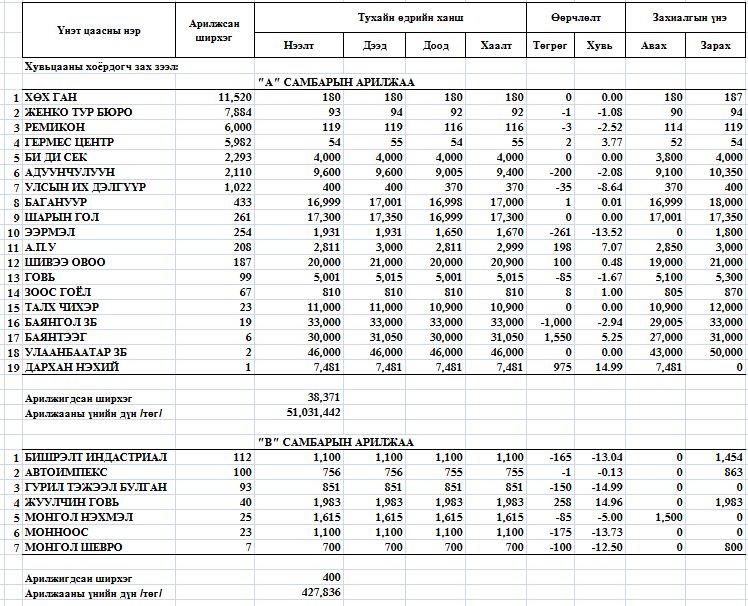 Нийт 26 үнэт цаас арилжсанаас 8 үнэт цаасны ханш өсч, 13 үнэт цаасны ханш буурч, 5 үнэт цаасны ханш тогтмол байлаа.