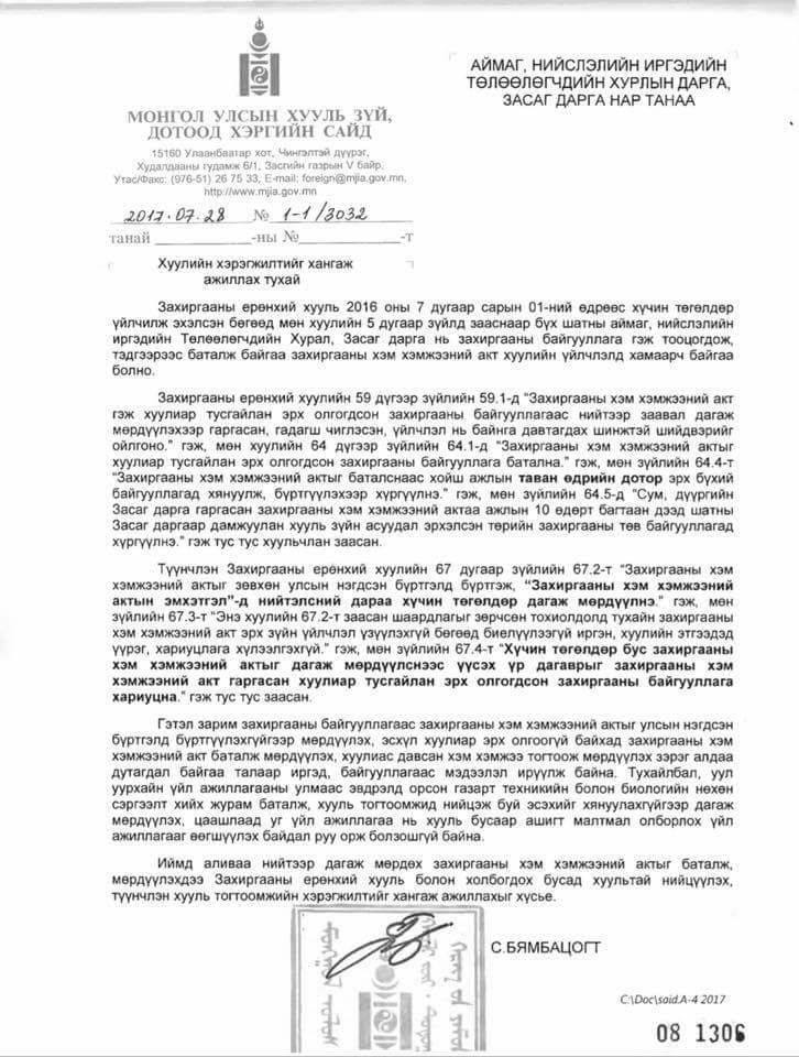 Хууль зүй, дотоод хэргийн сайд С.Бямбацогт Засаг дарга нарт хууль хэрэгжүүлэх тухай доорх албан тоотыг хүргүүлж байв.