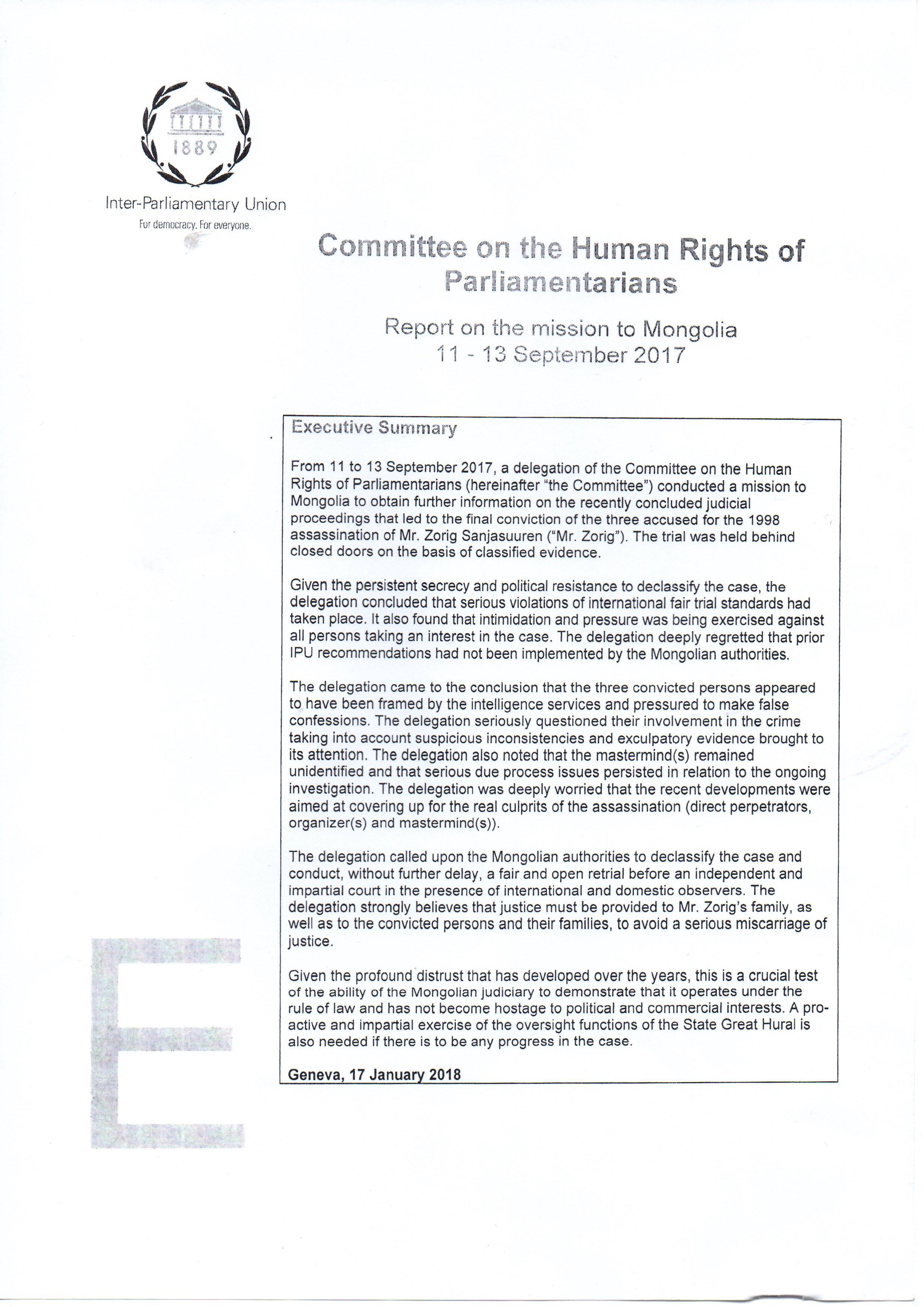 1998 онд Санжаасүрэнгийн Зориг агсны (цаашид “Зориг агсан" гэх) амь насыг хороосон хэрэгт буруудан, ял шийтгүүлсэн гурван яллагдагчийн хэргийг шүүхэд хянан шийдвэрлэсэн ажиллагааны талаар дэлгэрэнгүй мэдээлэл олж авах зорилгоор Олон Улсын Парламентын Холбоо /ОУПХ/-ны Парламентчдын Хүний эрхийн Хорооны төлөөлөгчид (цаашид “Хороо" гэх) 2017 оны 9 дүгээр сарын 11-нээс 13-ны өдрүүдэд Монгол Улсад томилогдон ажиллав. Хавтаст хэрэгт авагдсан нотлох баримтууд нь нууцын зэрэглэлд хамаардаг гэх шалтгаанаар шүүх хуралдааныг хаалттай явуулжээ.