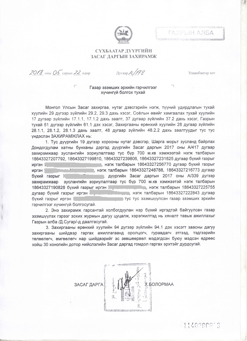 Тэгвэл тухайн бүсэд олгосон газрын эзэмших эрхийг албан ёсоор цуцалсан СБД-ийн Засаг даргын А/178 дугаартай захирамж өнөөдөр буюу 2018.05.22-нд гарлаа.
