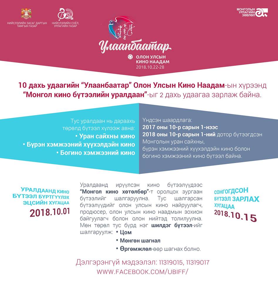 Энэ удаагийн наадмын хүрээнд Нийслэлийн Соёл Урлагийн Газраас санаачлан “Монгол кино бүтээлийн” уралдааныг 2 дахь жилдээ нээлттэй зарлаж, “Уран сайхны кино”, “Баримтат кино”, “Хүүхдийн кино бүтээл”, “Нээлтийн кино” гэсэн дөрвөн төрөлд тус бүр нэг кино бүтээлийг шалгаруулж 2018 оны 10-р сарын 15-ны өдөр зохион байгуулагдах наадмын нээлт, шагнал гардуулах ёслолын үеэр цом, өргөмжлөл, мөнгөн шагналаар шагнах юм.