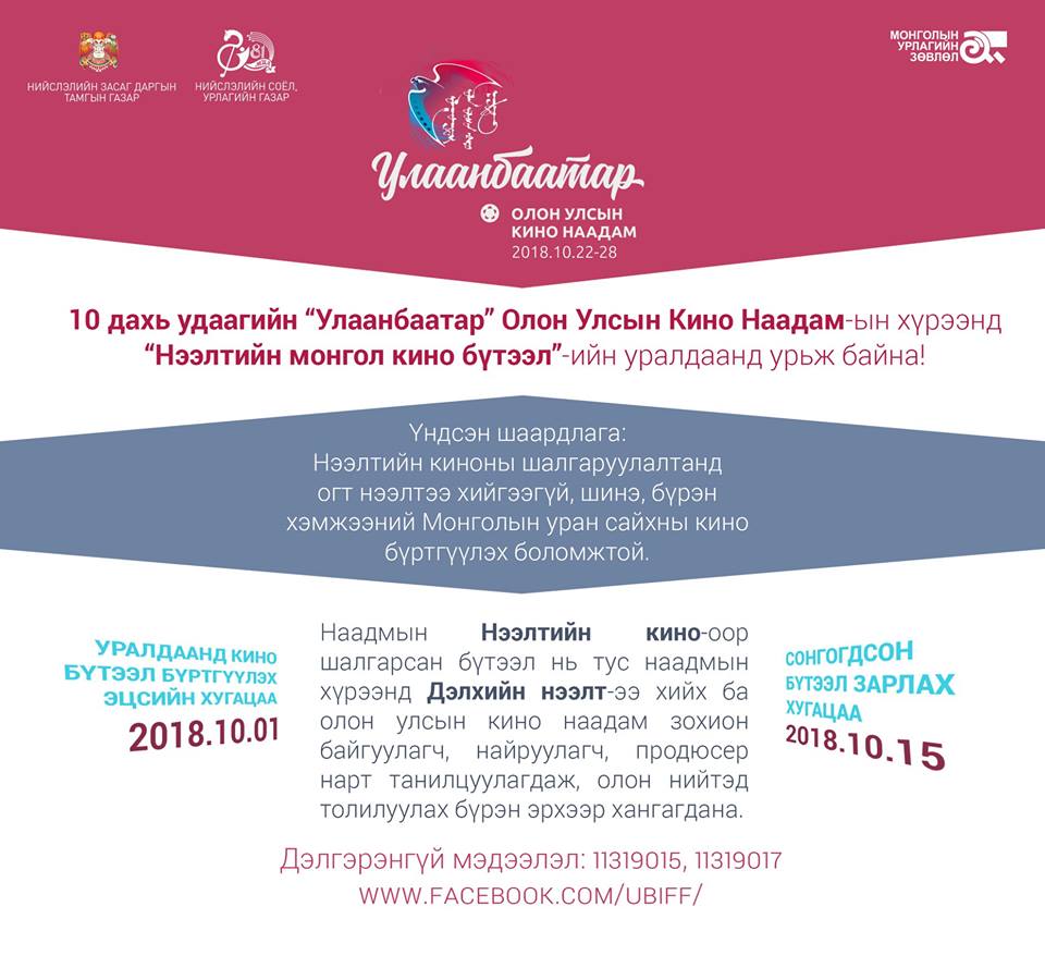 Нийслэлийн Соёл Урлагийн Газраас санаачлан, Монголын Кино Урлагийн Зөвлөл, Бүгд Найрамдах Франц Улсын Элчин Сайдын Яам, Монгол дахь Гёте Институт, Австралийн Элчин Сайдын Яамтай хамтран хамтран кино урлагийн салбарын олон улсын хамтын ажиллагааг нэмэгдүүлэх, Монголын кино урлагийн салбарыг хөгжүүлэх, дэлхийн нэр хүндтэй наадмуудад шалгарсан кино бүтээлийг Монголын үзэгчдэд хүргэх зорилготой 10 дахь удаагийн “Улаанбаатар” Олон Улсын Кино Наадам 2018 оны 10-р сарын 22-28-нд Улаанбаатар хотноо зохион байгуулагдах гэж байна.