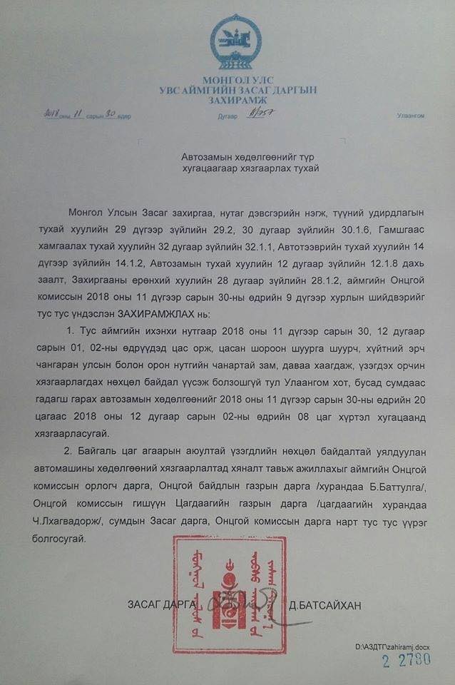 Увс аймгийн ихэнх нутгаар арваннэгдүгээр сарын 30, арванхоёрдугаар сарын 1, 2-ны өдрүүдэд цас орж, цасан шуурга шуурч, хүйтний эрч чангаран улсын болон орон нутгийн чанартай авто зам, даваа хаагдах нөхцөл байдал үүсэж болзошгүй тул иргэдийн аюулгүй байдлыг хангах зорилгоор Увс аймгийн төв Улаангом хот, бусад сумдаас гадагш гарах автозамын хөдөлгөөнийг 2018.11.30-ны өдрөөс 2018.12.02-ний 08.00 цаг хүртэл хугацаанд түр хязгаарлалаа.