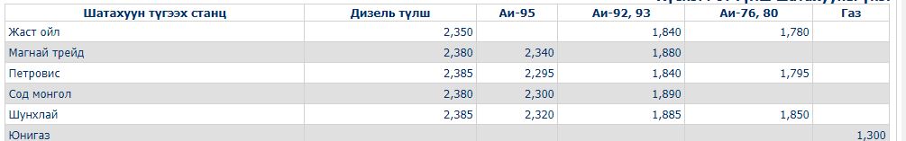 Дизель түлш шатахуун түгээх станцуудаар 2350-2385 төгрөг, Аи-76, 80 шатахуун 1780-1850 төгрөг, Аи-92, 93 шатахуун 1840-1890 төгрөг, Аи-95 шатахуун 2295-2340 төгрөг, Газ тогтмол 1300 төгрөгийн үнэтэй байв.