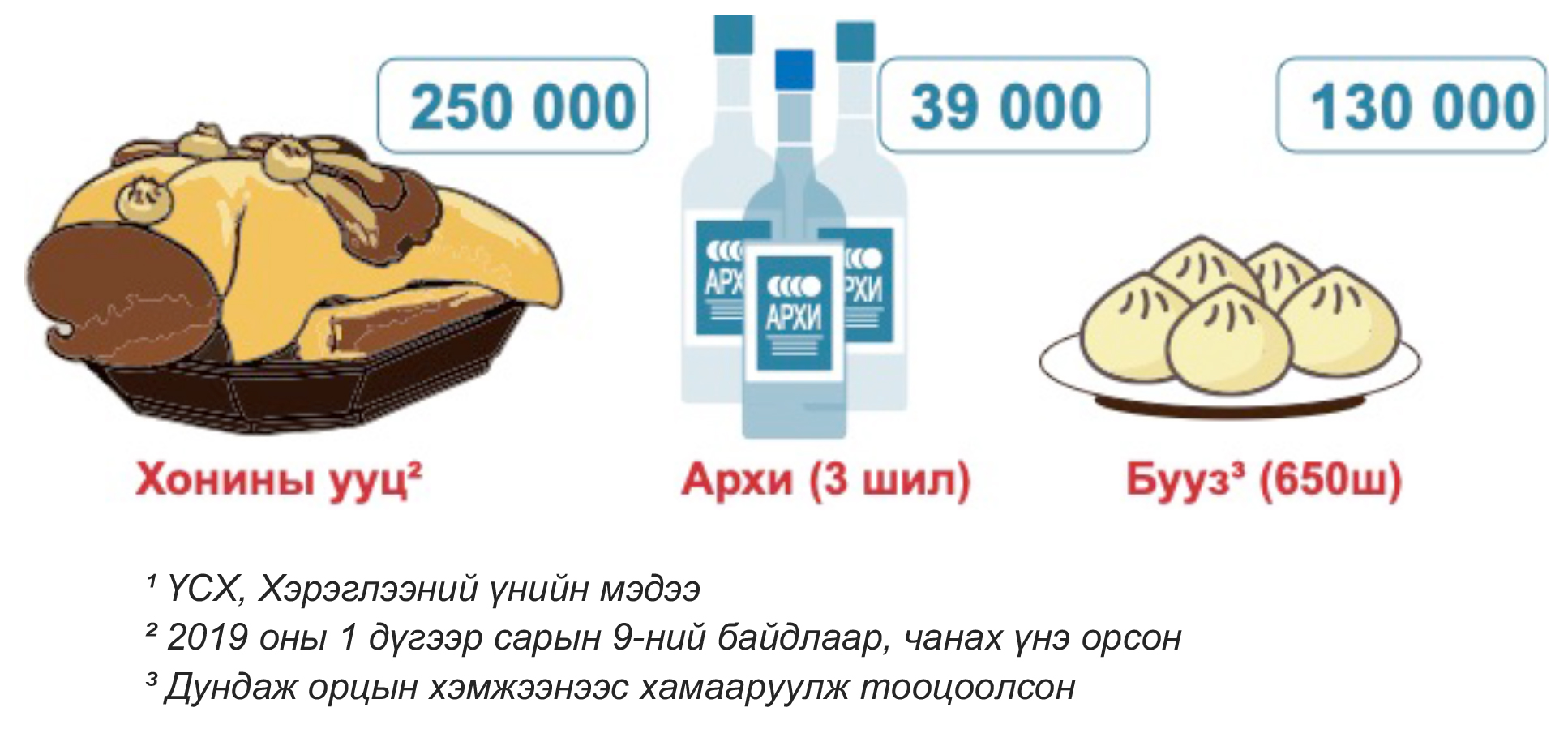 Дээрх хоёр төрлийн зардлын нийлбэрээр буюу идээ болон гарын бэлгийн дүнгээр нэг өрх цагаан сарын баярт дунджаар 1.5 сая төгрөгийн зардал гаргахаар байна.