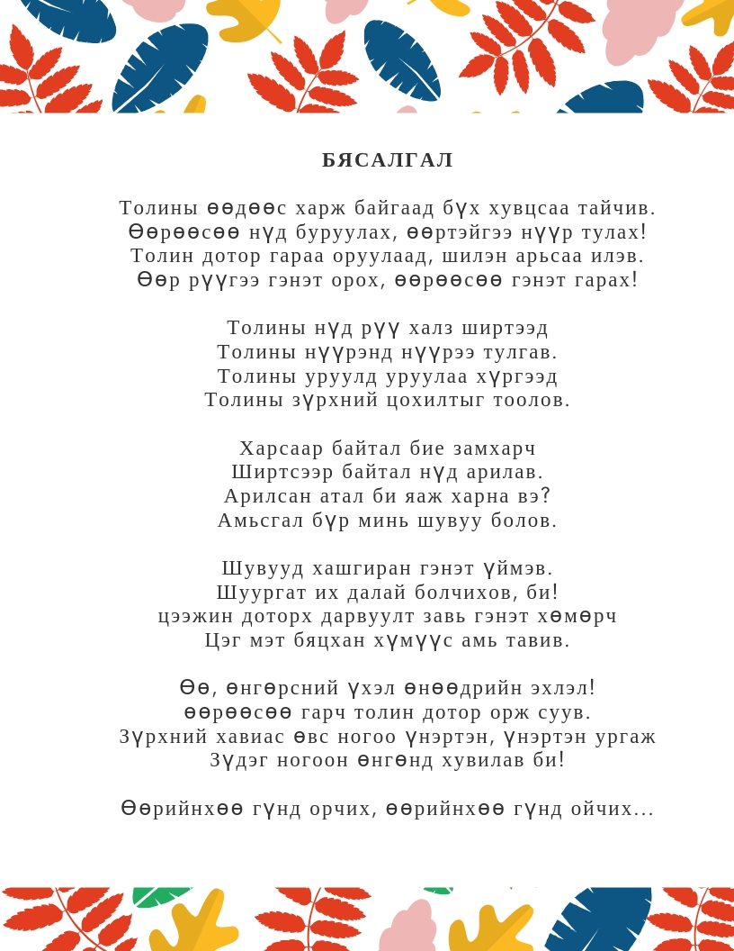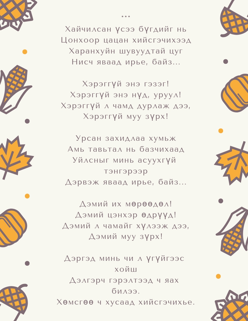 Зохиолч, яруу найрагч Л.Өлзийтөгсийн 2015 онд уншигчдын гарт хүрсэн "Толинд туссан будда" яруу найргийн номоос онцлох таван шүлгийг хүргэж байна.