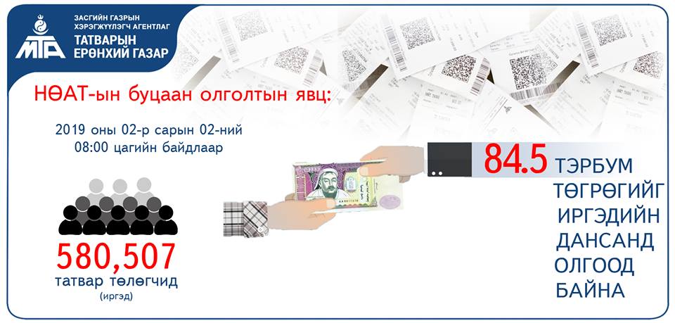 Татварын ерөнхий газраас НӨАТ-ын буцаан олголтын дүн мэдээг өнөөдөр өглөөний буюу хоёрдугаар сарын 2-ны 08:00 цагийн байдлаар танилцууллаа. Танд НӨАТ-ын буцаан олголттой холбоотой гомдол байвал 7011-5019 дугаараас тодруулна уу.