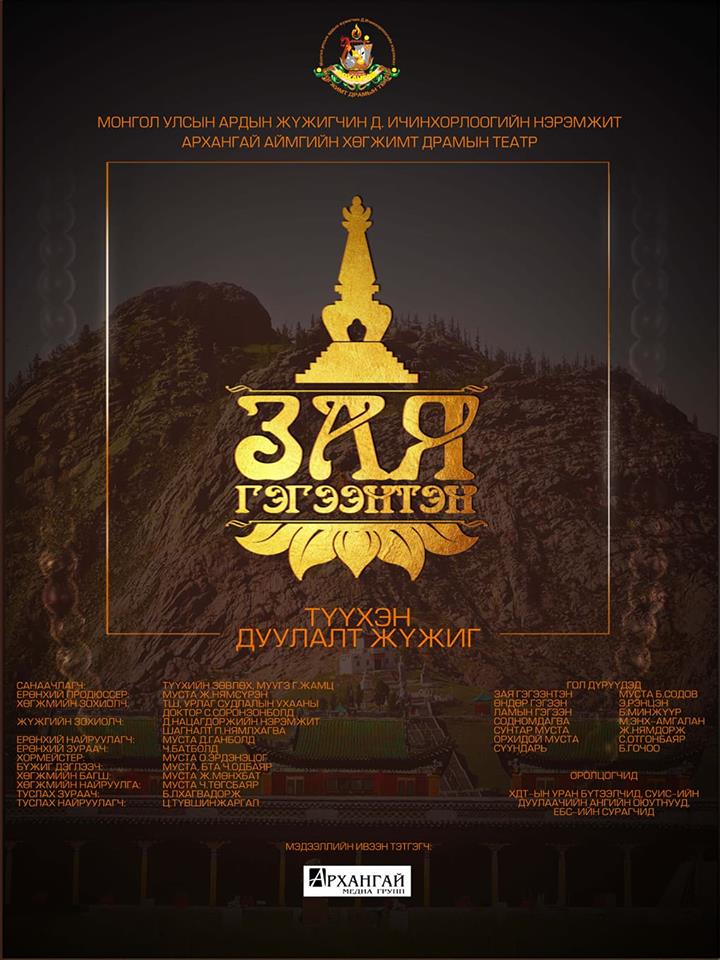 Монгол Улсын ардын жүжигчин Д.Ичинхорлоогийн нэрэмжит Архангай аймгийн Хөгжимт драмын театрын уран бүтээлчдийн шинэ уран бүтээл, "Зая гэгээнтэн" түүхэн дуулалт жүжгийг Улаанбаатар хотноо энэ сарын 28, гуравдугаар сарын 1, 2-ны өдрүүдэд Улаанбаатар чуулгын тайзнаа тоглох гэж байна.