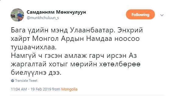 Тэгвэл НИТХ-ын төлөөлөгч С.Мөнхчулуун өөрийн цахим хуудаснаа намаасаа албан ёсоор гарсан талаараа бичжээ. Тэрбээр "Энхрий хайрт МАН-даа ноосоо тушаалчихлаа. Намгүй ч гэсэн амлаж гарч ирсэн "Аз жаргалтай хот" мөрийн хөтөлбөрөө биелүүлнэ" хэмээн жиргэжээ.