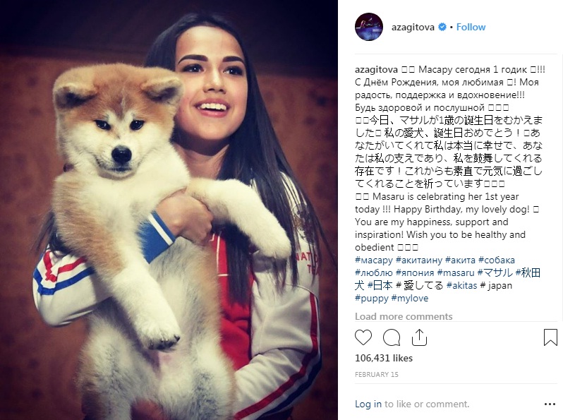 Японы акита үүлдрийн нохойны холбооноос өнгөрсөн 2018 онд “Пёнчан 2018” олимпийн наадмын аварга Алина Загитова, мэргэжлийн сүмогийн их аварга Асашёорюү нарт акита үүлдрийн гөлөг бэлэглэсэн билээ. Загитовагийн нохой Масарү нэртэй бөгөөд Аса аваргын Масао гөлөгний “эгч” юм. Энэ сарын 15-нд Масарү ой хүрч, Алина инстаграм хуудсаараа дамжуулан, баяр хүргэлээ.