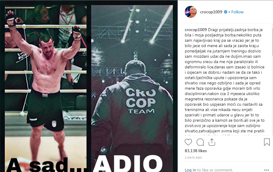 Хорватын цагдаа буюу Мирко Крокоп зодог тайлснаа зарлалаа. Холимог тулааны домог, 44 настай Крокоп өмнө нь хэд хэдэн удаа зодог тайлж байсан ч энэ удаад үнэхээр эргэн ирэхгүй нь бололтой. Крокоп инстаграм хуудсаараа дамжуулан, бэлтгэлийн үеэр цус харваснаа фэнүүддээ хэлж, цаашид тулалдах боломжгүй болсноо зарласан.