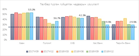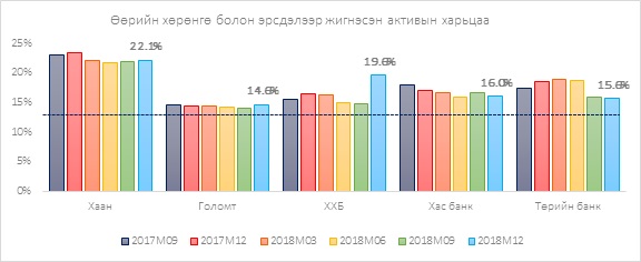Санхүүгийн болон үйл ажиллагааны эрсдлээс сэргийлж банкны хувьцаа эзэмшигчид тодорхой хэмжээний хөрөнгийг Монголбанкинд бэлнээр байршуулдаг. Өөрийн хөрөнгийн хувь нь активын 14 хувиас доошгүй байх шаардлагатай. Тэгвэл Монголбанкны мэдээлэлд тулгуурласан дараах зурагт энэ харьцааг бүх банкууд хангаж байна.
