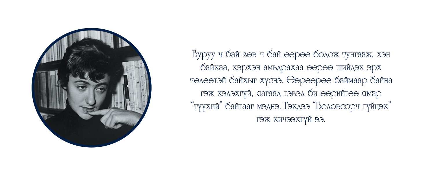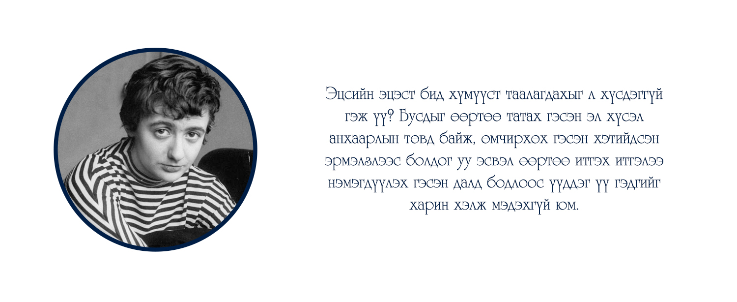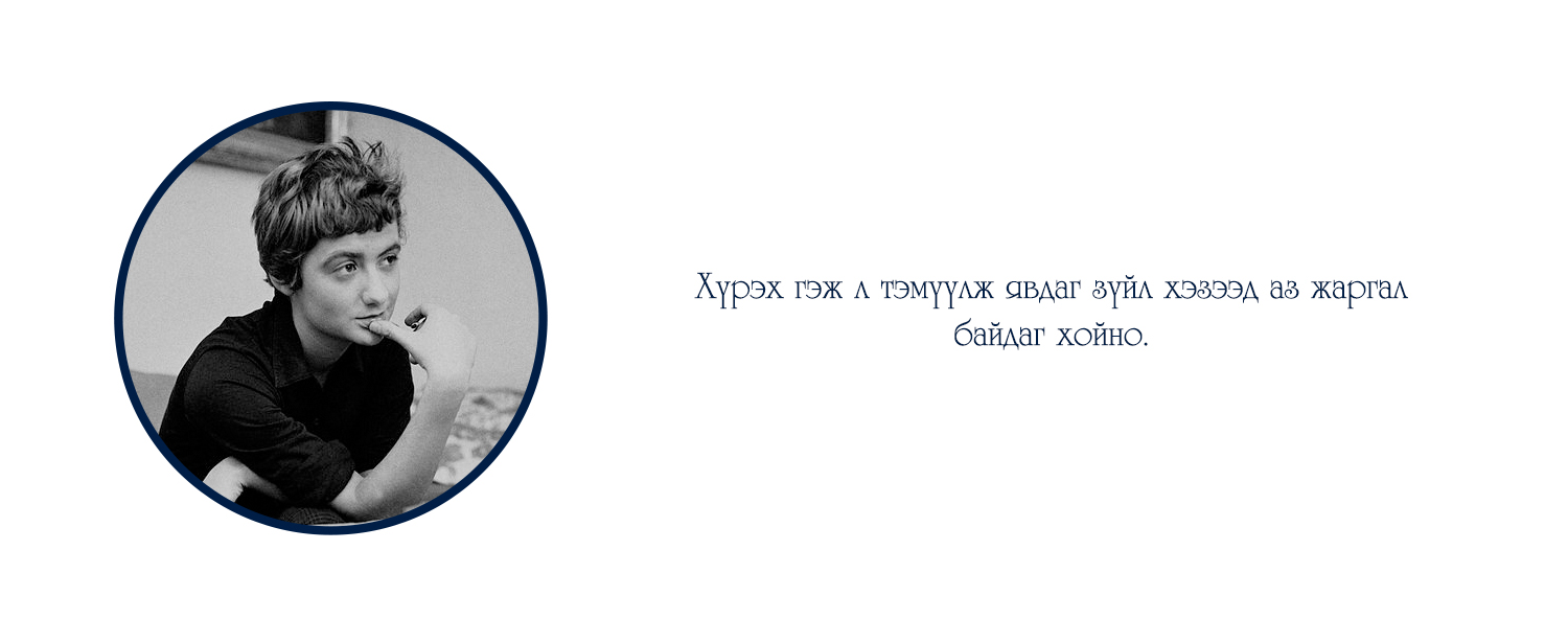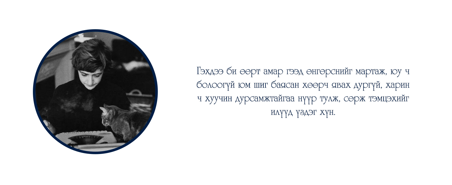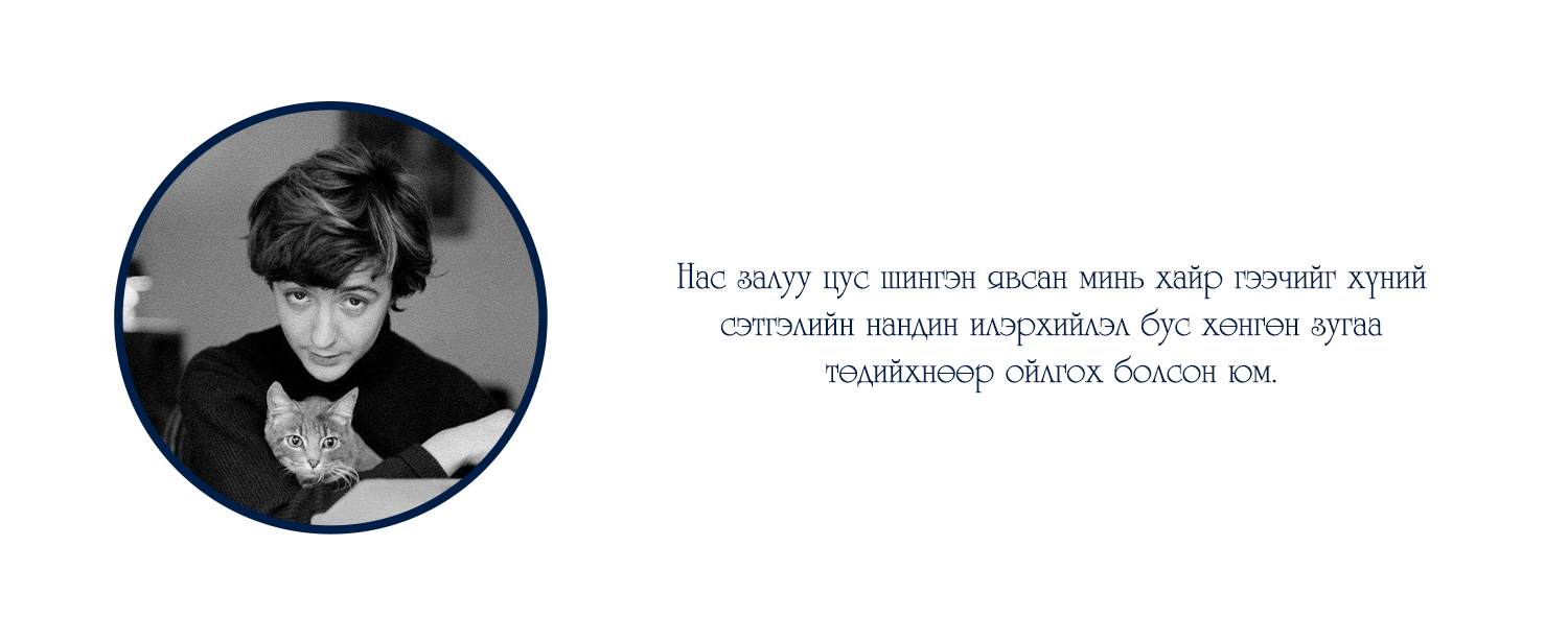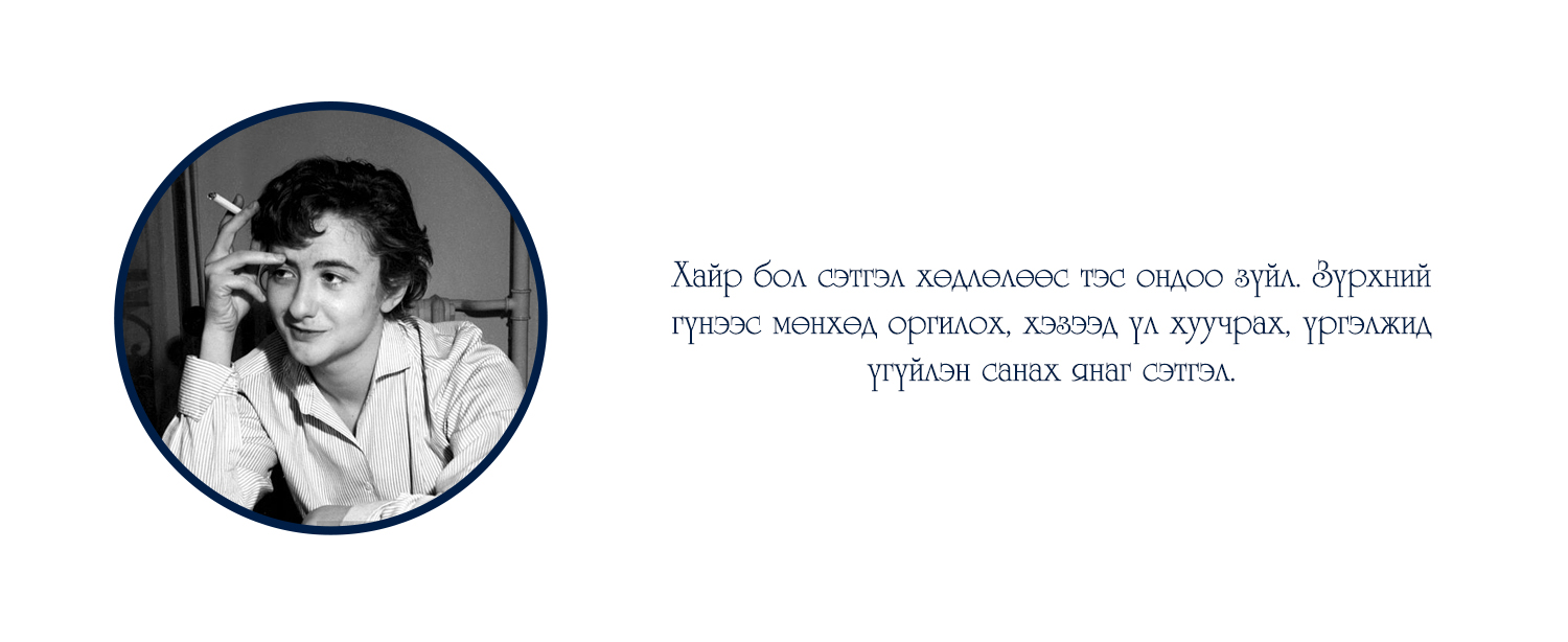 "Тэр гэхийн аргагүй уйт бодол буй биеийг минь бүхэлд нь эзэмдэхэд түүнийг би гуниг гэх сүржин үгээр гоёчлон нэрлэж эс түвдэв. Гуниг гээч намайг саяхныг хүртэл соронздон татдаг байлаа. Гэтэл одоо ганилант бодлын хүлээснээсээ хагацаж үл чадаад гэмших сэтгэлд автан суух амуй. Уйтгарлах, харамсах, гэмшихийг утгаа би сайн мэднэ, харин гуних гээчийг л үзсэнгүй явлаа. Өнөөдөр тэрхүү гуниг намайг торгон нэхээст тор адил тал талаас ороон бүчиж, алгуурхан тамирыг минь барж, амьд хүн бүрээс алсалган холдуулав..." Энэ бол Францын нэрт зохиолч Франсуаза Саганы "Сайн уу, гуниг минь" номын эхлэл хэсэг.