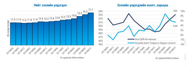 Нийт зээлийн үлдэгдэл дөрөвдүгээр улиралд өмнөх улирлаас 5.4 хувь өсч 17.1 их наяд төгрөгт хүрсэн байна. Мөнгөний нийлүүлэлтийн өсөлт өндөр байгаатай уялдан нийт зээлийн үлдэгдэл ч өсөлтөө хадгалсан хэвээр байна. Нийт зээл, ДНБ-ий харьцаа 2017 оны эцэст 49 хувь байсан бол 2018 оны эцсээр 53 хувь болж өсчээ.