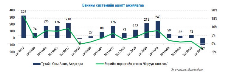Банкны системийн оны эхнээс хуримтлагдсан ашиг 2018 оны гуравдугаар улиралд 42 тэрбум төгрөг байсан бол дөрөвдүгээр улиралд 97 тэрбумын алдагдал хүлээсэн байна. Банкны системийн ашигт ажиллагаа буюу өөрийн хөрөнгийн өгөөж -3.3 хувьд хүрсэн. Дөрөвдүгээр улирлын байдлаар 14 банкнаас 12 банк санхүүгийн тайлангаа зарласан бөгөөд 12 банкны нийт ашиг 257.3 тэрбум төгрөг байна. Төв банкнаас зарласан статистикт алдаа гарсан эсвэл тайлангаа зарлаагүй 2 банк 354 тэрбум төгрөгийн алдагдалтай ажилласан байх магадлалтай байна.