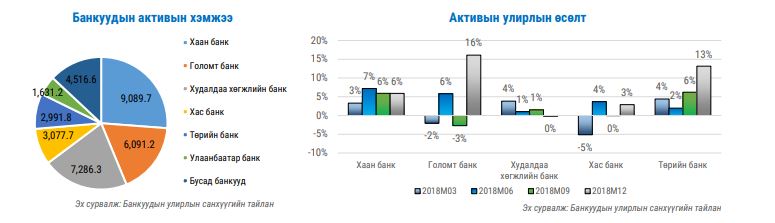 Банкны секторын нийт активын 87 хувийг Топ 6 банк, 64 хувийг топ 3 банк эзэлж байна. Активын улирлын өсөлтийн хувьд дөрөвдүгээр улиралд Голомт банк 16 хувийн өсөлт, Төрийн банк 13 хувийн өсөлт үзүүлсэн. Сүүлийн 4 улирлын өсөлтийг харахад Хаан банкны активын өсөлт тогтвортой 6 хувь орчимд байгаа бол Хас болон Голомт банкны активын өсөлт хэлбэлзэл өндөртэй байна.