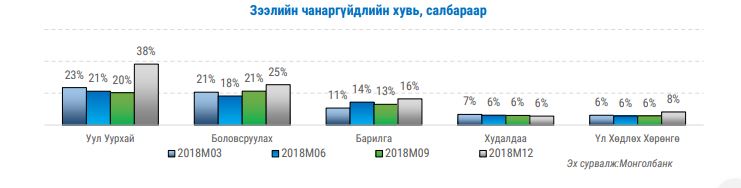 Нийт зээлийн үлдэгдлийн 49.3 хувийг худалдаа, үл хөдлөх, барилга, боловсруулах болон уул уурхайн салбар, 18 хувийг бусад салбар эзэлж байна. Харин цалин тэтгэврийн зээл 26 хувь буюу 4.4 их наяд төгрөгийн үлдэгдэлтэй байна. 2018 оны хугацаанд худалдааны салбарт нийтдээ 5.3 их наяд төгрөг, уул уурхайн салбарт 1.5 их наяд төгрөгийн зээл олгосон байна. Тухайн салбарын шинээр олгосон зээлийн хэмжээг жилийн ДНБ-нд харьцуулахад хамгийн өндөр нь худалдааны салбар 173 хувь, барилгын салбар 104 хувь байна. Өөрөөр хэлбэл худалдаа болон барилгын салбар нь жилд бүтээж буй нэмэгдэл өртгөөсөө илүү өндөр зээл авч байна.