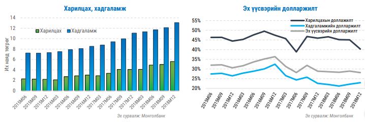 Нийт харилцахын хэмжээ 2018 оны дөрөвдүгээр улиралд харилцах өмнөх улирлаас 11.6 хувиар өсч 5.6 их наяд, хадгаламж 7.8 хувиар өсч 13 их наяд төгрөгт хүрсэн. Нийт эх үүсвэрийн долларжилт 28 хувь, харилцах 40 хувь, хадгаламж 23 хувь байна. Өмнөх улиралтай харьцуулахад эх үүсвэрийн долларжилт 1 нэгж хувиар буурсан. Үүний гол шалтгаан нь валютын харилцахын долларжилтийн 5 нэгж хувийн бууралт юм.