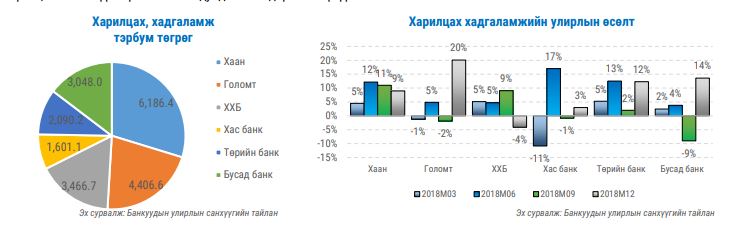 Нийт харилцах хадгаламжийн 30 хувийг Хаан банк, 21 хувийг Голомт банк, 17 хувийг Худалдаа хөгжлийн банк, 8 хувийг Хас банк, 10 хувийг Төрийн банк, бусад банк 15 хувийг эзэлж байна. Банкуудын харилцагчаас татсан эх үүсвэр буюу харилцах хадгаламжийн хэмжээ дөрөвдүгээр улиралд системийн хэмжээнд 1.7 их наяд төгрөгөөр буюу 9.1 хувиар өссөн. Энэ улиралд Төрийн банк болон Голомт банкны харилцагчийн эх үүсвэр системийн дунджаас өндөр өсөлт үзүүлжээ.
