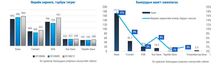 Банкуудын 2018 оны ашгийг харвал Хаан банк 171.5 тэрбум төгрөг, Голомт банк 45.7 тэрбум төгрөг, Худалдаа хөгжлийн банк 19.6 тэрбум төгрөгөөр тэргүүлж байна. Харин өөрийн хөрөнгийн өгөөжийн үзүүлэлтээр Хаан банк 17%, Голомт банк 9%, Хас банк 6%-р эхний 3-т орсон байна. Топ 6 банкны нийт ашиг 255.9 тэрбум төгрөгт хүрсэн байна.