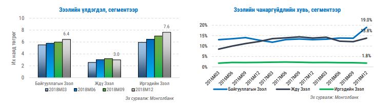 Банкны зээлийн үлдэгдлийг сегментээр харвал байгууллагын зээл 6.4 их наяд, жижиг дунд үйлдвэрлэлийн зээл 3 их наяд, иргэдийн зээл 7.6 их наяд төгрөг байна. Өмнөх улиралтай харьцуулахад байгууллагын болон иргэдийн зээл харгалзан 7 ба 9 хувиар өссөн байгаа бол жижиг дунд үйлдвэрлэлийн зээл 6 хувиар буурсан байна.