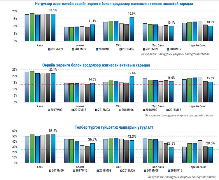 Банкуудаар задлан харвал Хаан банк 38 тэрбум, Голомт банк 79.5 тэрбум, Худалдаа хөгжлийн банк 177 тэрбум, Төрийн банк 15.4 тэрбум төгрөгөөр өөрийн хөрөнгөө нэмэгдүүлжээ. Ашигт ажиллагааны үзүүлэлт буюу өөрийн хөрөнгийн өгөөжөөр Хаан банк 17 хувиар тэргүүлж 9 хувиар Голомт банк, 6 хувиар Хас банк удаалжээ.