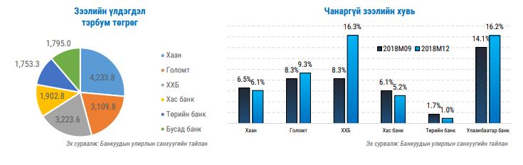 Нийт зээлийн үлдэгдлийн 89 хувийг системийн топ 5 банк эзэмшиж байна. Банкуудаар харвал Хаан банк 26 хувь, Худалдаа хөгжлийн банк 20 хувь, Голомт банк 19 хувь, Хас банк 12 хувь, Төрийн банк 11 хувийг эзэлж байна. Зээлийн чанаргүйдлийн хувьд системийн хэмжээнд өмнөх улирлаас 2.1 нэгж хувиар өсч 10.4 хувьд хүрсэн. Хаан банк, Хас банк, Төрийн банкны чанаргүй зээлийн хувь өмнөх улирлаас буурсан бол Худалдаа хөгжлийн банкны чанаргүй зээлийн хувь 8 нэгж хувиар, Голомт банкны хувьд 1 нэгж хувиар, Улаанбаатар хотын банкны хувьд 2.1 нэгж хувиар өссөн байна. Энэ нь системийн хэмжээнд байгууллагын зээлийн чанаргүйдэл өсч, иргэдийн зээлийн чанаргүйдлийн хувь буурсантай холбоотой байна.