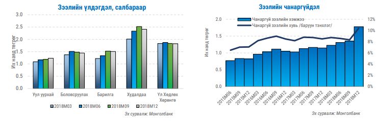 Шинээр олгосон зээлийн 22 хувийг худалдааны салбарт /1.6 их наяд төгрөг/, 8 хувийг уул уурхайн салбарт /560 тэрбум төгрөг/, 5 хувийг барилгын салбарт /345 тэрбум төгрөг/, 4 хувийг боловсруулах салбарт /314 тэрбум төгрөг/ олгосон байна. Салбаруудыг 2018 онд шинээр олгосон зээл болон нэрлэсэн ДНБ-ий харьцаагаар харвал хамгийн өндөр зээлийн хөшүүрэгтэй салбарт Худалдааны салбар 172 хувь, барилгын салбар 103 хувиар тэргүүлж байна. Тус үзүүлэлт 100 хувиас их байгаа нь тухай салбарын жилд бүтээж буй нэмэгдэл өртөг нь банкнаас авсан зээлээс нь бага байгааг харуулж байна.