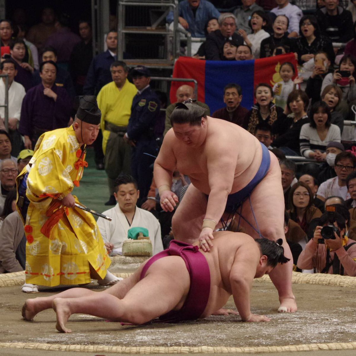 Японы Осака хотод явагдаж байгаа мэргэжлийн сүмогийн Хаврын тэмцээнд түрүүлэх бололцоотой хоёр бөх үлдлээ. Хоёулаа Монголын залуус. Их аварга Хакүхо 13 дараалан ялж, башёг тэргүүлэн, ганц унаатай маэгашира Ичиножёо нэхэж явна. Маргааш Хакүхо озэки Такаясүтай, Ичиножёо озэки цол горилогч Такакэйшёотой учраа таарсан. Ичиножёо унаж, Хакүхо давахад их аварга 42 дахь түрүүгээ авах юм. Харин Ичиножёог өвдөг шороодуулж чадвал Такакэйшёо озэки цолныхоо болзлыг биелүүлэх учиртай.