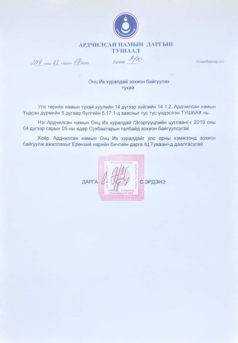 АН-ын дарга С.Эрдэнийн гарын үсэгтэй Онц их хуралдай зохион байгуулах тухай тушаалд “Улс төрийн намын тухай хуулийн 14.1.2, АН-ын Үндсэн дүрмийн 5.17.1-д үндэслэн тушаах нь: