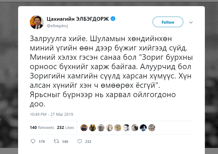 Er ni Elbegee eruul bish bolson yum bishuu? Onigootoi yum ! Mongol ulsiin erunhiilugch baisan hun . Setegtsiin uvchtei yum shig l eliirch baih gej! Olon ulsad shivshigee tarhina dee
