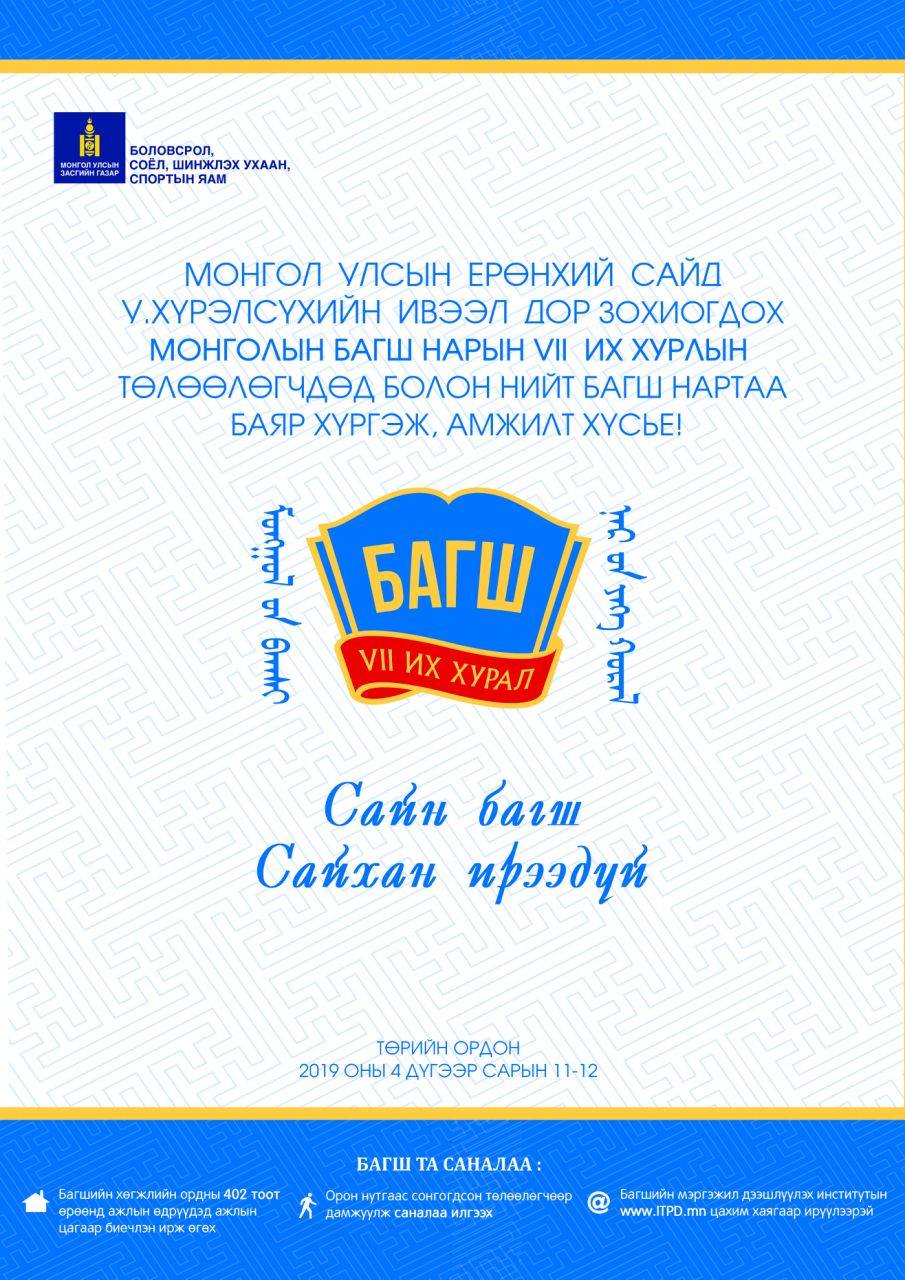 Монгол улсын Ерөнхий Сайд У.Хүрэлсүхийн ивээл дор Монголын багш нарын VII их хурал 4 дүгээр сарын 11, 12-нд Төрийн ордонд болно.