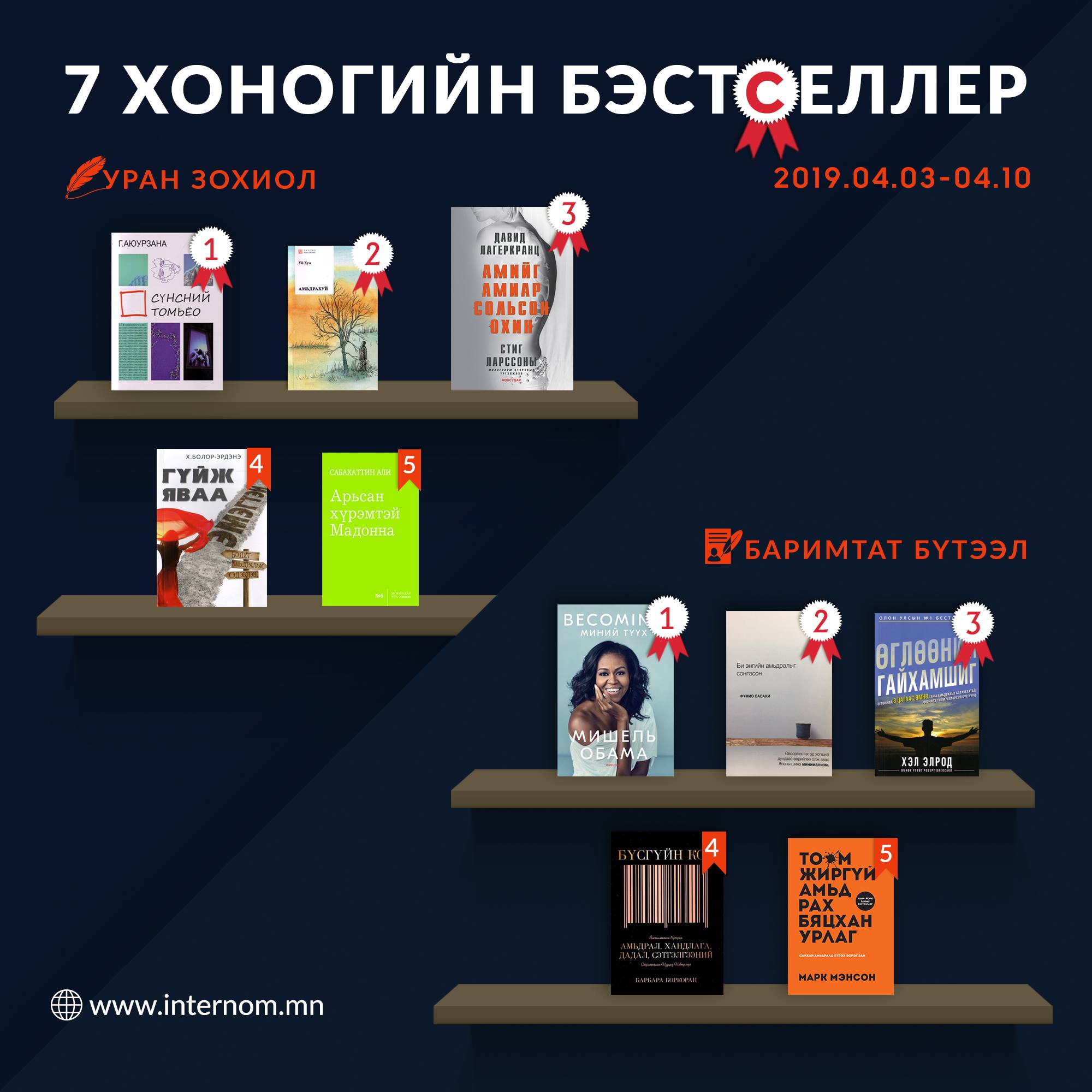 "Монсудар" хэвлэлийн газар, "Интерном" номын дэлгүүрээс 7 хоног бүр уран зохиолын болон баримтат "Бэстселлер" бүтээлүүдийг тодруулдаг. Энэ долоо хоногт зохиолч, яруу найрагч, орчуулагч Г.Аюурзанын "Сүнсний томьёо" шинэ роман жагсаалтыг тэргүүлсэн бол хятадын зохиолч Үй Хуагийн "Амьдрахуй" тууж удаах байрт байна.