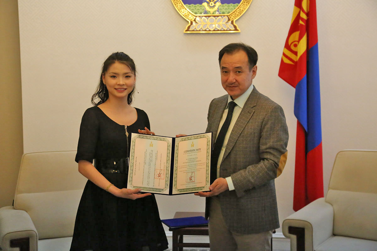 Гадаад харилцааны сайд Д.Цогтбаатар өчигдөр /2019.04.12/ Монгол Улсын Соёлын элчээр томилогдсон Гавьяат жүжигчин, балетчин Отгонтөгсийн Анужин, Монгол Улсаас ОХУ-ын Красноярск хотод суух Өргөмжит консул Евгений Алексеевич Кузьмин нарт Монгол Улсын Соёлын элчийн гэрчилгээг гардуулан өгөв.