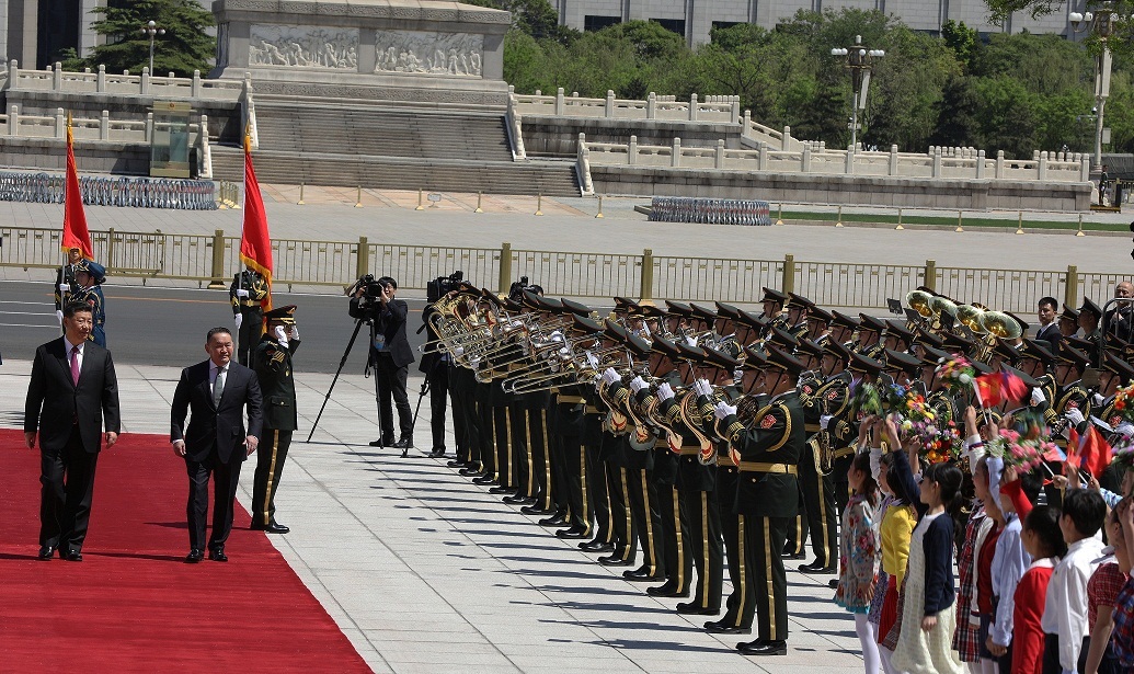 Төрийн тэргүүнийг Ардын Их хурлын талбайд хүрэлцэн ирмэгц БНХАУ-ын дарга Ши Жиньпин угтан мэндчилж БНХАУ-ын талаас угтах ёслолд оролцож буй өндөр, дээд албан тушаалтнуудыг танилцуулав.