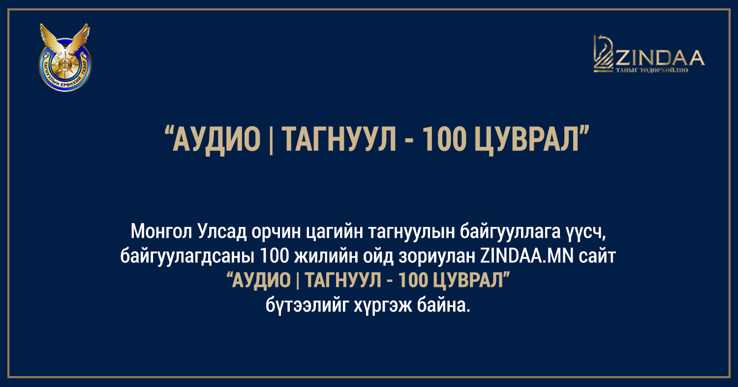 Монгол Улсад орчин цагийн тагнуулын байгууллага үүсч, байгуулагдсаны 100 жилийн ойд зориулан ZINDAA.MN сайт тагнуулын байгууллагын архив, түүхт үйл явдал, зохиолд тулгуурлан “АУДИО | ТАГНУУЛ - 100 ЦУВРАЛ” төслийг эхлүүлж байна. Бид энэхүү цувралаар Аудио зохиолын 100 сонирхолтой бүтээлийг уншигч, сонсогч танд хүргэх болно.