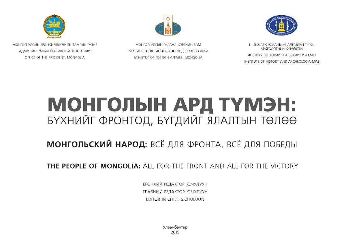 Эдгээр түүхийн баримт, материалуудыг доктор профессор С.Чулуун редакторлан эрдэмтэн, түүхчдийн хамт эмхэтгэж Монгол Улсын Ерөнхийлөгчийн Тамгын газар, Монгол Улсын Гадаад харилцааны яам, Шинжлэх ухааны академийн Түүх, археологийн хүрээлэнтэй хамтран “МОНГОЛЫН АРД ТҮМЭН: Бүхнийг фронтод, бүгдийг ялалтын төлөө” нэртэйгээр гаргасан юм.