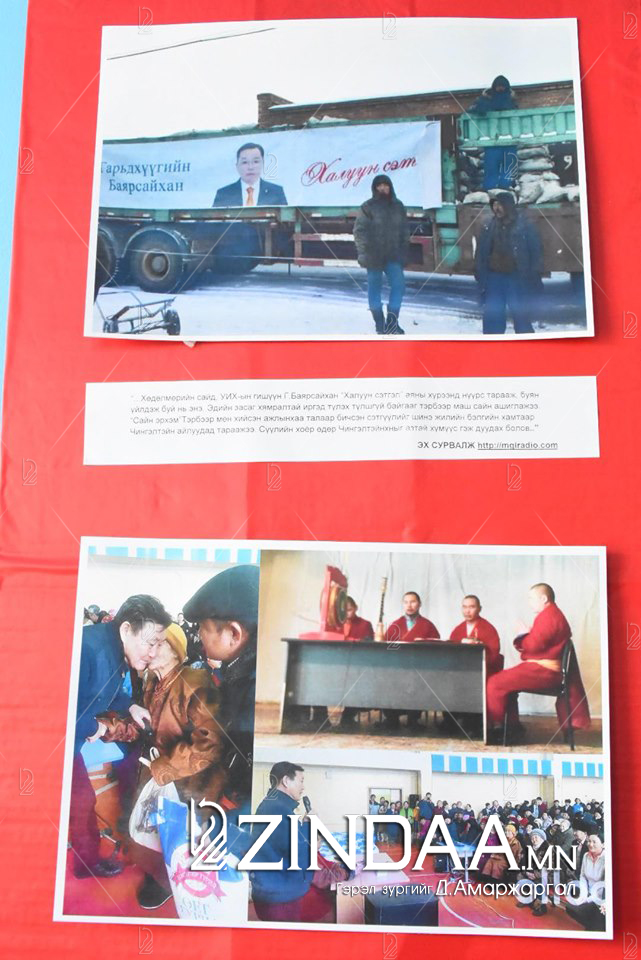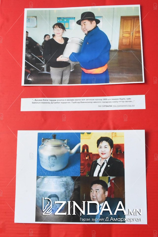 Улстөрчид болоод сонгогчдод нэгийг бодогдуулсан үзэсгэлэнд дэлгэгдсэн "бүтээл"-үүдтэй танилц. Магадгүй, ийм зүйлс танай гэрт ч байж болох юм. Энэ бүхнийг дэлгэн тавьсны зорилго нь улстөрчид сонгогчдыг бэлэг сэлтээр худалдаж авдаггүй, хуурч мэхэлдэггүй болъё, сонгогчид ч мөн үүнийг үл ойшоодог болцгооё гэсэн агуулгатай болохыг ойлгож, эргэцүүлнэ биз ээ.