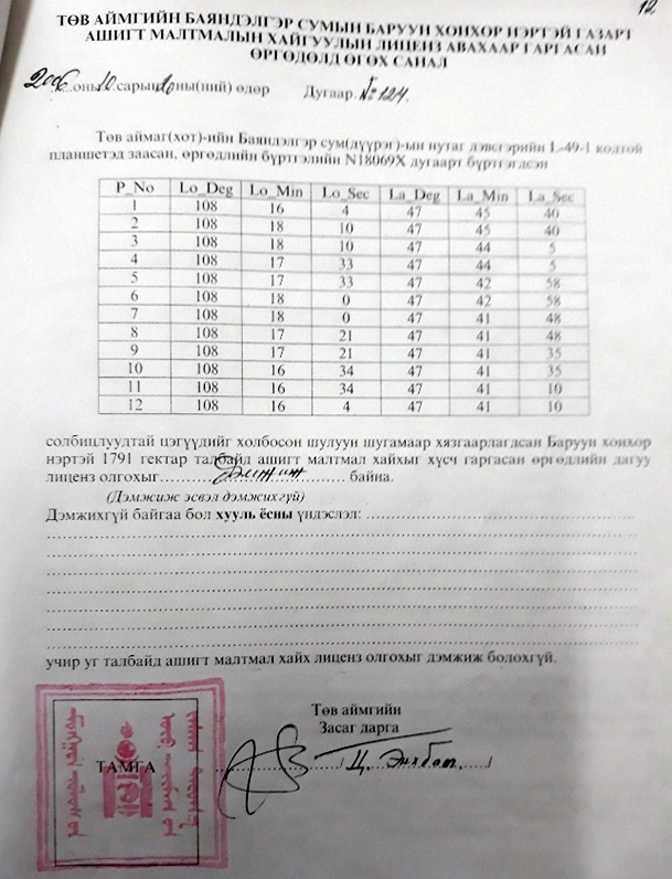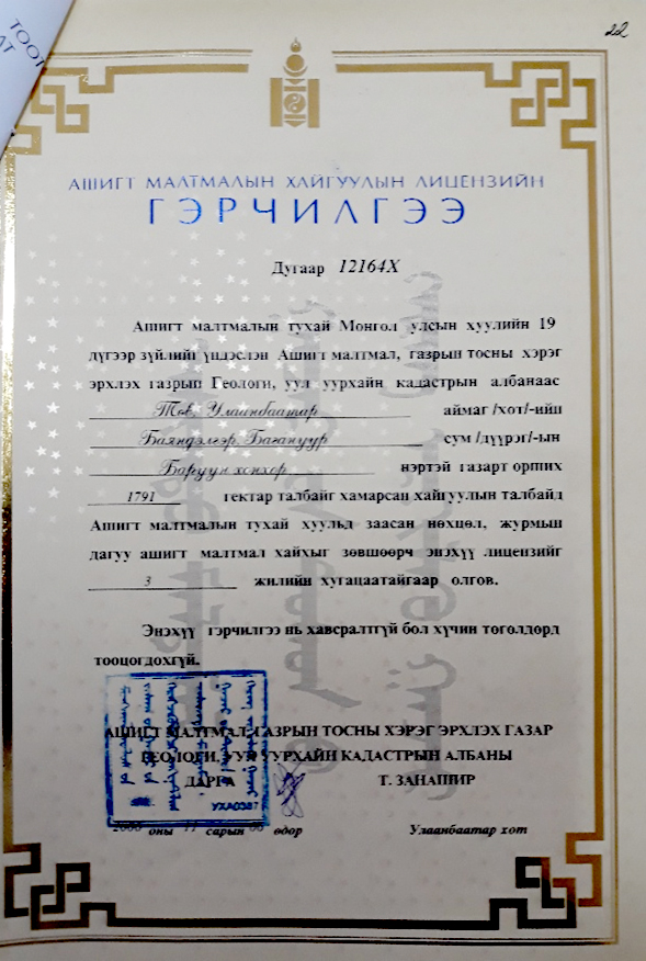 Улмаар Төв аймгийн Засаг дарга Ц.Энхбатын дэмжсэн саналыг үндэслэн 2006 оны 11 дүгээр сарын 06-ны өдөр ГУУКГ-ын дарга Т.Занашир гарын үсэг зурж Төв аймаг Баяндэлгэр, Улаанбаатар хот Багануур дүүрэг, Баруун хонхор гэсэн 12164Х тоот Ашигт малтмалын хайгуулын лицензийг олгожээ.